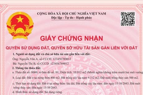 + Trang 1 gồm: Quốc huy, Quốc hiệu; dòng chữ “Giấy chứng nhận quyền sử dụng đất, quyền sở hữu tài sản gắn liền với đất” in màu đỏ; mã QR; mã Giấy chứng nhận; mục “1. Người sử dụng đất, chủ sở hữu tài sản gắn liền với đất:”; mục “2. Thông tin thửa đất:”; mục “3. Thông tin tài sản gắn liền với đất:”; địa danh, ngày tháng năm ký Giấy chứng nhận và cơ quan ký Giấy chứng nhận; số phát hành Giấy chứng nhận (số seri); dòng chữ “Thông tin chi tiết được thể hiện tại mã QR”;